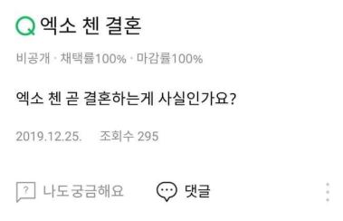 한편 엑소 첸 결혼과 관련해 성지글까지 등장했습니다. 2019년 12월 25일 비공개로 게시물을 올린 네티즌은 '엑소 첸 곧 결혼하는 게 사실인가요?'라는 질문을 게시했습니다. 이에 '헛소리입니다'라는 답글을 남겼습니다. 하지만 13일 엑소 첸의 결혼 사실이 공식적으로 발표되며 성지글이 되었습니다.