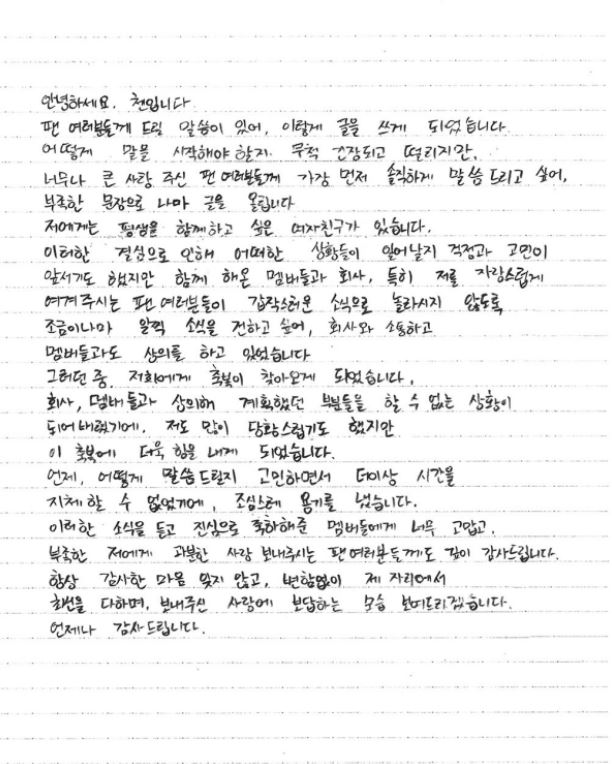 이어서 “저에게는 평생을 함께하고 싶은 여자 친구가 있습니다. 이러한 결심으로 인해 어떠한 상황들이 일어날지 걱정과 고민이 앞서기도 했지만 함께 해온 멤버들과 회사, 특히 저를 자랑스럽게 여겨주시는 팬 여러분들이 갑작스러운 소식으로 놀라시지 않도록 조금이나마 일찍 소식을 전하고 싶어, 회사와도 소통하고 멤버들과도 상의를 하고 있었습니다’ 라고 이야기했다.